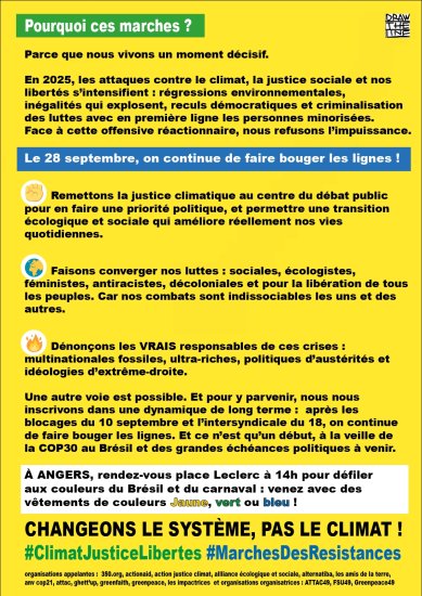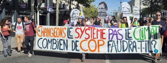Venant après les grandes mobilisations sociales des 10 et 18 septembre, cette mobilisation pour le climat et la justice sociale était nécessaire. 2025 est en effet marquée par des attaques d’une rare intensité dans les champs écologique et social : régressions environnementales dans toute l’UE, aux USA et dans le reste du monde, inégalités sociales, reculs démocratiques et criminalisation des luttes, ostracisation des migrant·e·s et réfugié·e·s (en particulier climatiques). Contre le capitalisme prédateur des humains et de la nature, face au danger mortel que constitue le réchauffement climatique induit par la surconsommation d’énergies fossiles, il faut inlassablement continuer à nous mobiliser pour un avenir écosocialiste !