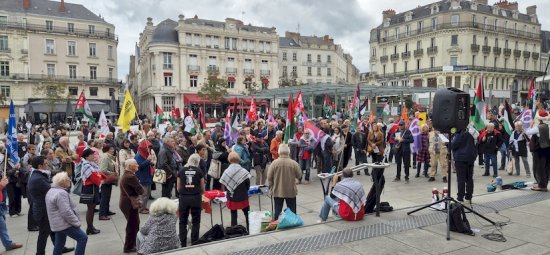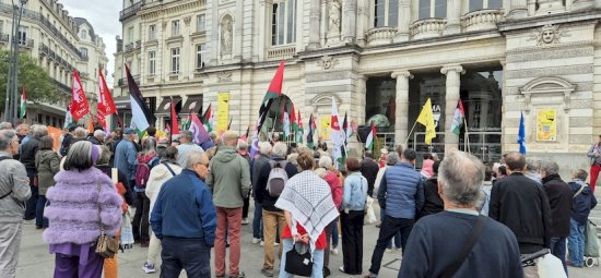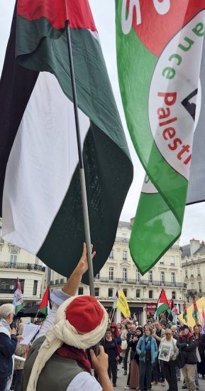 À noter : la police nationale de Retailleau a cherché à 15h30, alors que le rassemblement avait commencé depuis une demi-heure, à susciter un trouble à l’ordre public en verbalisant une manifestante qui écrivait à la craie quelques slogans sur le sol de la place du Ralliement. Cette provocation des plus minable est à l’image de la politique de l’État français : d’un côté faire mine de reconnaître un État palestinien pour préserver ses points d’appui au Proche-Orient arabe ; de l’autre réprimer dès qu’il le peut le mouvement de solidarité avec le peuple palestinien (et ne prendre aucune sanction sérieuse contre Netanyahou et son gang fasciste et génocidaire). Cela doit nous pousser à renforcer toujours davantage le mouvement de solidarité avec la Palestine.