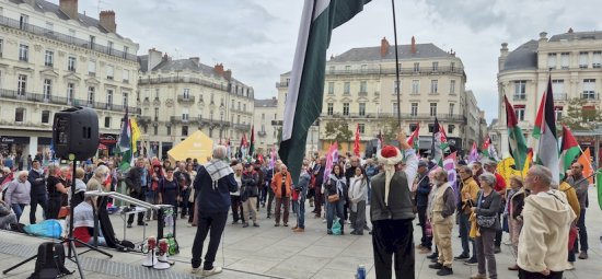 Pour le rassemblement hebdomadaire de solidarité avec le peuple palestinien et de dénonciation du génocide en cours, ce sont à nouveau autour de 250 personnes qui, ce 27 septembre 2025, ont répondu à l’appel de l’AFPS49 et de ses partenaires. L’occasion de rappeler que la reconnaissance de l’État palestinien par plusieurs États impérialistes, dont l’État français, ne suffirait pas à faire cesser le massacre en cours à Gaza et le déni du droit à l’autodétermination du peuple palestinien. L’occasion aussi d’affirmer notre soutien à la Global Sumud Flotilla, déjà bombardée par des drones, mais à laquelle l’État français refuse toute protection. De larges extraits - très émouvants - du Journal de bord de Gaza 106 de Rami Abou Jamous ont été lus à la tribune.