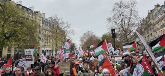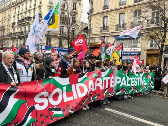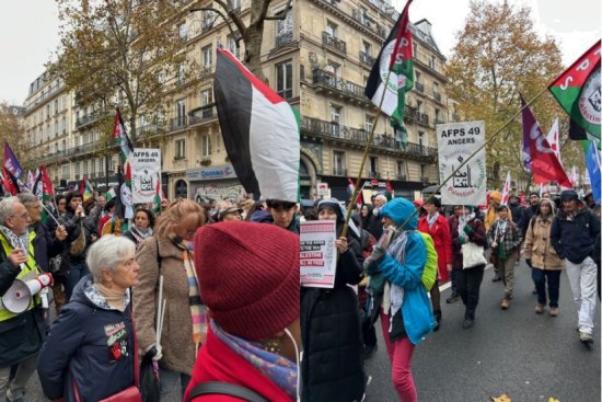 Samedi 29 novembre, journée internationale de solidarité avec le peuple palestinien, des dizaines de milliers de manifestant·e·s (50.000 selon les organisateurs, 8.400 selon la police de l’État français) ont défilé à Paris (entre les places de la République et de la Nation) à l’appel de plus de 85 organisations, associations, syndicats et partis de gauche. L’exigence d’un vrai cessez-le-feu (définitif !), de la fin du génocide et de droits égaux pour toutes et tous sur le territoire historique de la Palestine s’y est largement affirmée. Un car de 80 places avait été affrété par l’AFPS49 au départ d’Angers. Venu·e·s en bus, en train ou en voiture, plus d’une centaine d’Angevin·e·s ont participé (malgré la pluie !) à cette grande manifestation du 29 novembre (malheureusement occultée par les grands médias, y compris Le Monde et Mediapart !)