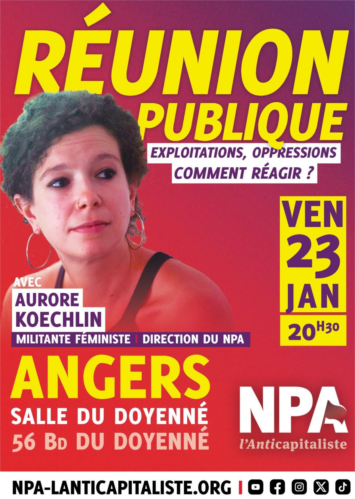 - vendredi 23 janvier à 20h30 : meeting du NPA49, salle du Doyenné à Angers, avec Aurore Koechlin, membre de la direction nationale du NPA-A