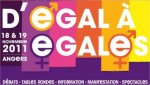 Le collectif angevin « d’Égal à Égales » d’organisations associatives, syndicales et politiques (ATTAC, Collectif Émancipation, MFPF, Quazar , LDH, AL, NPA, PG, EELV, FSU, Solidaires...) a organisé un grand évènement féministe à Angers au mois de novembre 2011, date anniversaire de la loi Veil sur l’avortement : le Festival « d’Égal à Égales » (dont on peut encore écouter le clip de présentation). Inauguré vendredi 18 novembre par un débat nourri avec Annick Coupé (Solidaires) et Christine Bard (historienne du féminisme) devant plus de 200 personnes massées salle Thiers-Boisnet, il s’est poursuivi le lendemain au même endroit, ponctué par une manifestation de 250 à 300 personnes en centre-ville. Compte-rendu, photos, liens vers les enregistrements des débats et vers le reportage de FR3..