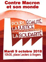 Macron, président des ultra-riches en France. Exécutant indigène d’un système uniquement gouverné par la quête du profit maximum, jusqu’à épuiser la vie des travailleurs et détruire les conditions naturelles de vie de l’humanité. Contre lui, toutes les occasions doivent être saisies, telles que celle du mardi 9 octobre et de ses manifestations (à 10h30 à Angers, place Leclerc, Cholet, place Travot, Saumur, place Bilange et Segré, place du port) à l’appel de FO, CGT, Solidaires, UNL, UNEF et FSU. Il faut nous appuyer sur cette étape de mobilisation pour construire une véritable riposte à Macron.